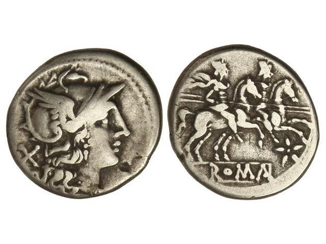 Denario. 200-190 a.C. ANÓNIMO. Rev.: Los Dióscuros a caballo a derecha, encima (estrellas), debajo estrella de cinco puntas. En exergo: ROMA. 3,80 grs. (Hoja en anverso). Ca-No cat.; FFC-37. MBC-.