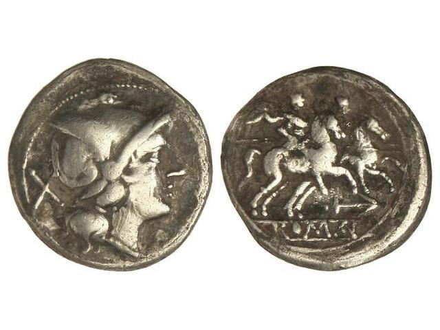 Denario. 209-208 a.C. ANÓNIMO-20A. Rev.: Los Dióscuros a caballo a derecha, encima estrellas, debajo ancla. En exergo: ROMA. 3,70 grs. (Pátina irregular). Cal-4; FFC-8. MBC-.