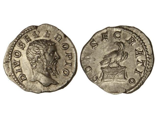 Denario. - ¿211? d.C. - SEPTIMIO SEVERO. ACUÑACIÓN PÓSTUMA. - Anv.: DIVO SEVERO PIO. Cabeza descubierta a derecha. Rev.: CONSECRATIO. Águila a derecha cabeza a izquierda sobre altar. 2,90 grs. C-86. EBC-. - -