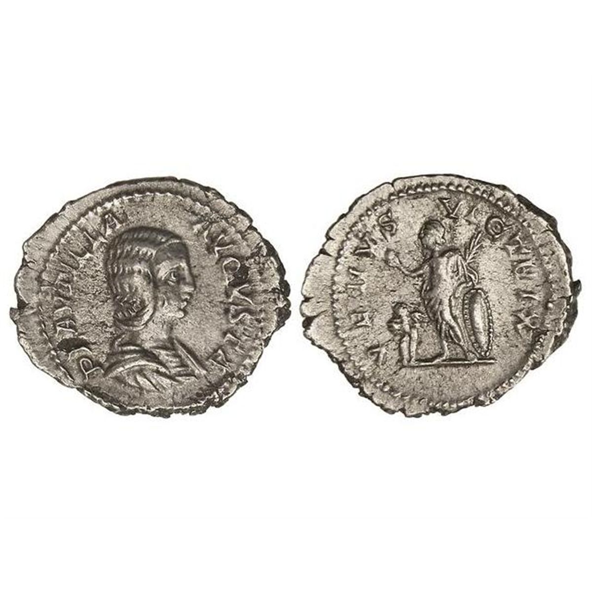Denario. - 212 d.C. - PLAUTILLA. - Anv.: PLAVTILLA AVGVSTA. Busto a derecha. Rev.: VENVS VICTRIX. Venus a izquierda con palma y manzana, a los pies Cupido y escudo. C-25. MBC+. - -