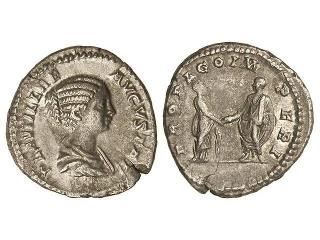 Denario. 212 d.C. PLAUTILLA. Anv.: PLAVTILLAE AVGVSTAE. Busto a derecha. Rev.: PROPAGO IMPERI. Caracalla y Plaurilla, frente a frente, dándose la mano. (Leves rayitas en anverso). C-21. MBC+.