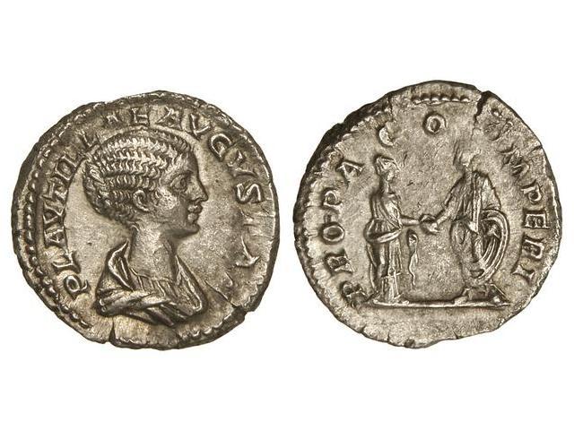 Denario. 212 d.C. PLAUTILLA. Anv.: PLAVTILLAE AVGVSTAE. Busto a derecha. Rev.: PROPAGO IMPERI. Caracalla y Plautilla en pie de frente. (Posiblemente descolgada). C-21. EBC-/MBC+.
