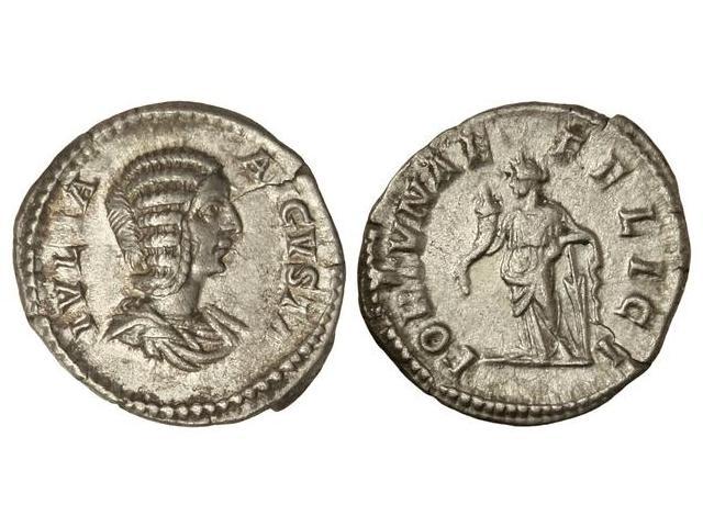 Denario. 217 d.C. JULIA DOMNA. Anv.: IVLIA AVGVSTA. Busto a derecha. Rev.: FORTVNAE FELICI. Fortuna estante a izquierda. 3,140 grs. (Grieta en cospel). C-55. EBC-/MBC+.