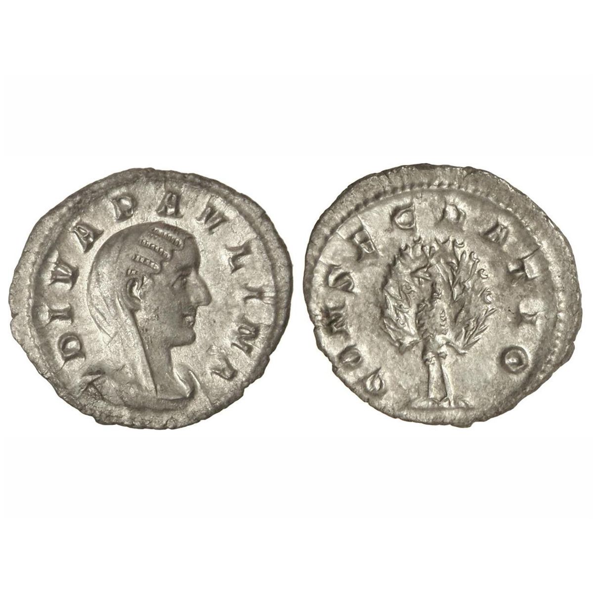 Denario. - 235-236 d.C. - PAULINA. - Anv.: DIVA PAVLINA. Busto velado a derecha. Rev.: CONSECRATIO. Pavo real de frente con la cola desplegada. 2,23 grs. RARA. C-1. EBC+. - -