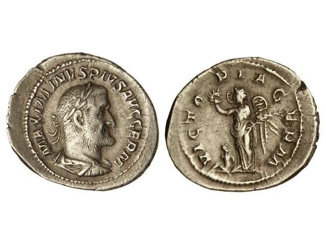 Denario. 235-238 d.C. MAXIMINO I. Anv.: Busto laureado a derecha. MAXIMINVS PIVS AVG. GERM. Rev.: VICTORIA GERM. Victoria estante, con palma y corona a izquierda, cautivo a sus pies. 3,20 grs. AR. C-109.8 var. MBC+.