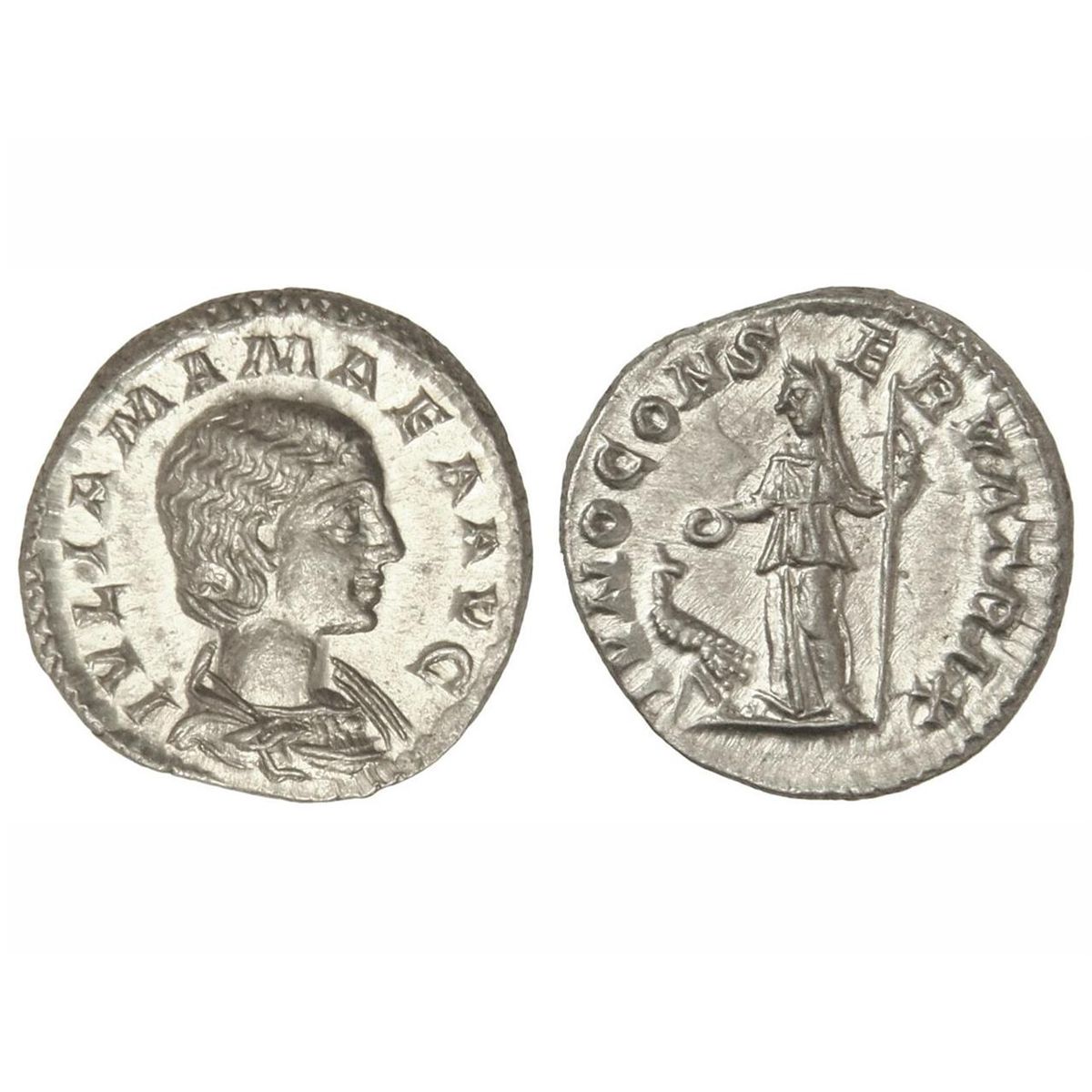 Denario. - 235 d.C. - JULIA MAMAEA. - Anv.: IVLIA MAMAEA AVG. Busto a derecha. Rev.: IVNO CONSERVATRIX. Juno en pie a izquierda a sus pies pavo real. 3,57 grs. C-37. SC. - -