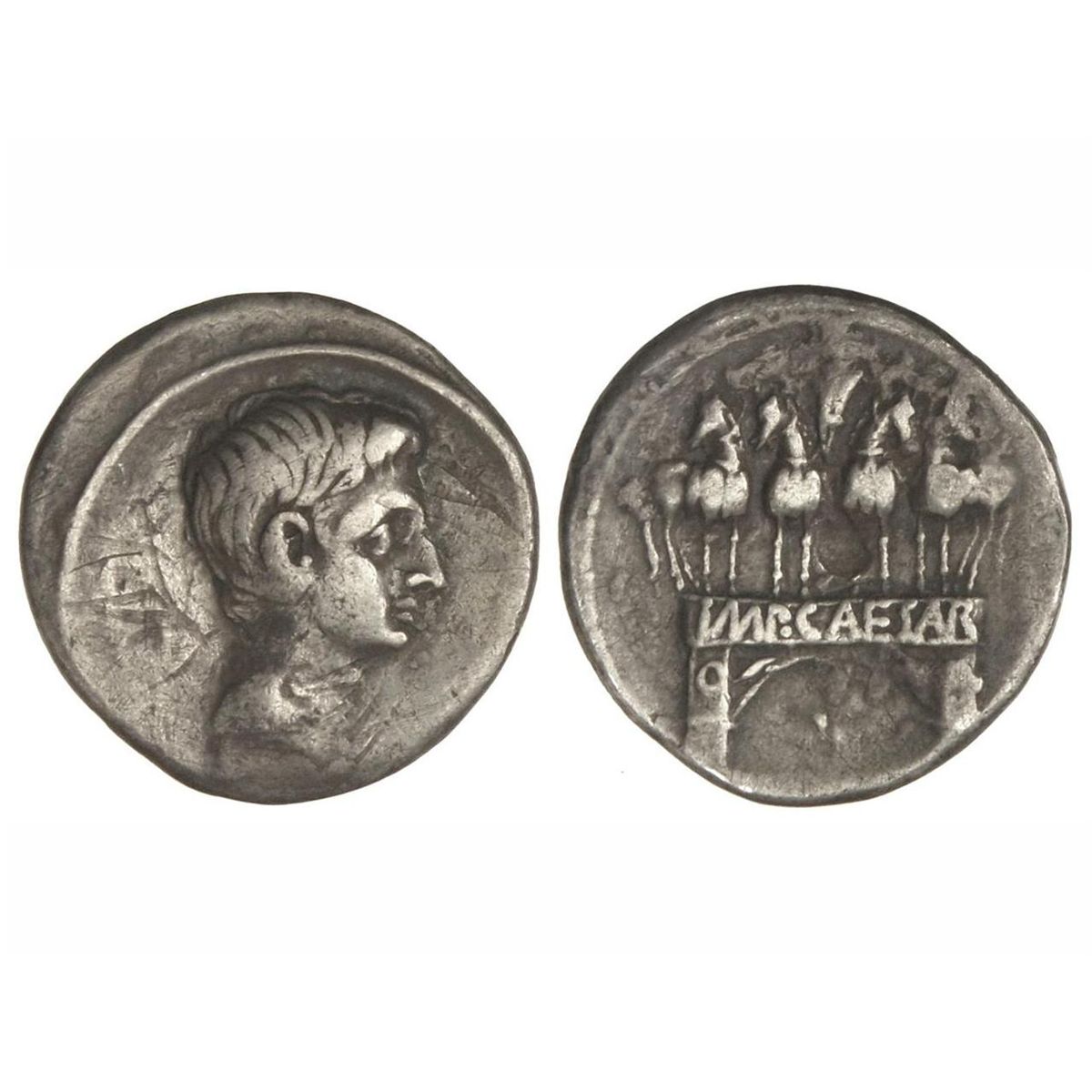 Denario. - 29-27 a.C. - AUGUSTO. - Anv.: Cabeza descubierta de Augusto a derecha. Rev.: Arco del Triunfo, surmontado por cuadriga de frente, guiada por Augusto. Leyenda en el friso: IMP. CAESAR. 3,72 grs. (Rayas y golpes). C-123; Cal-685 y FFC-98. MBC. - -