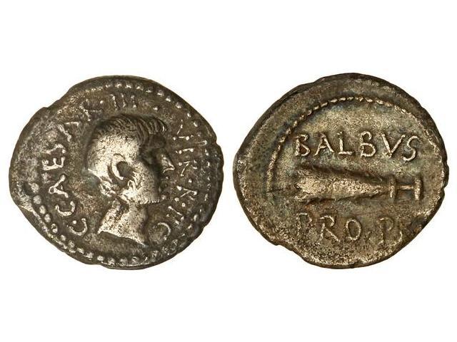 Denario. - 41 a.C. - CORNELIA-78. AUGUSTO. - L. Cornelius Balbus. - Anv.: C. CAESAR III VIR. R. P. C. Cabeza descubierta de Augusto a derecha. Rev.: BALBVS PRO. PR. Maza. Pátina. (Pequeñas oxidaciones). MUY ESCASA. C-417; Cal-507; FFC-266. (MBC+). - -