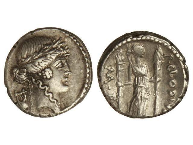 Denario. - 42 a.C. - CLAUDIA-15. - P. Claudius M. f. Turrinus. - Rev.: Diana Lucifera de pie a derecha, con dos largas antorchas en sus manos. P. CLODIVS M. F. 4 grs. Cal-428; FFC-569. MBC+. - -