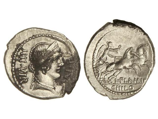 Denario. 43 a.C. FLAMINIA-2a. L. Flamijnius Chilo. Anv.: Cabeza diademada de Venus a derecha. IIII VIR. PRI. FL. 4,20 grs. (Oxidaciones en anverso). Cal-582; FFC-7111. (EBC-).