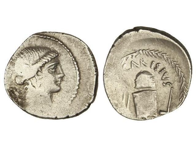Denario. 46 a.C. CARISIA-1a. T. Carisius. Rev.: Tenaza, yunque, cuño y martillo, encima (T.) CARISIVS, todo dentro de corona de laurel. 3,80 grs. (Pequeña oxidación en anverso). Cal-380; FFC-541. MBC/MBC-.