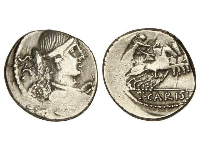 Denario. 46 a.C. CARISIA. T. Carisius. Anv.: Busto alado de la Victoria a derecha, detrás S.C. 4 grs. (Algo descentrada). Cal-378a; FFC-539. (MBC).