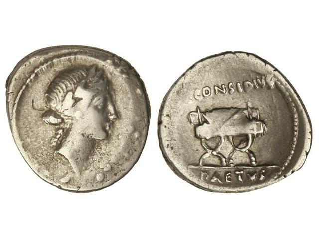 Denario. 46 a.C. CONSIDIA. C. Considius Paetus. Anv.: Cabeza laureada de Apolo a derecha, detrás de círculo de puntos. 3,60 grs. (Golpes). Cal-459; FFC-592. MBC.