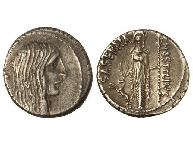 Denario. - 48 a.C. - HOSTILIA-4. - L. Hostilius Saserna. - Anv.: Cabeza de Galia a derecha, detrás (carnyx). 3,90 grs. Cal-624; FFC-756. MBC+. - -