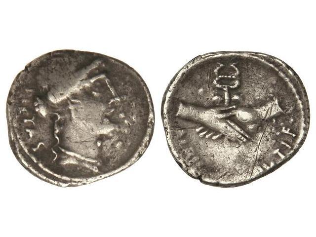 Denario. 48 a.C. POSTUMIA-10. D. Postumius Albinus Bruti f. Rev.: Dos manos juntas sosteniendo un caduceo alado, debajo (ALBINVS) BRVTI F. 3,69 grs. Pátina. (Oxidaciones). Cal-1219; FFC-1075. BC+/MBC-.