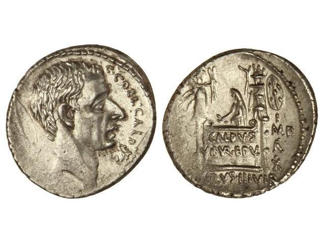Denario. - 51 a.C. - COELIA-11. - C. Coelius Caldus. - Anv.: Cabeza de cónsul a derecha, detrás lanza y trofeo militar, delante jabalí. C. COEL. CALDVS COS. 3,70 grs. Cal-448; FFC-581. EBC-. - -