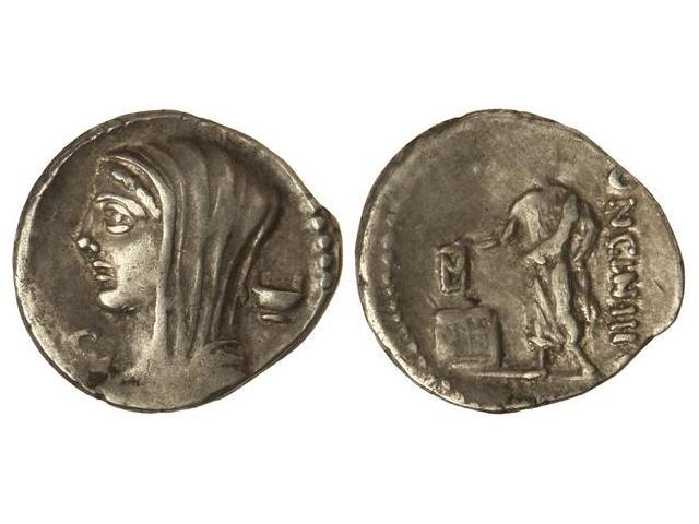 Denario. - 55 a.C. - CASSIA-10. - L. Cassius Longinus. - Anv.: Busto velado de Vesta a izquierda, detrás copa, delante letra. 3,80 grs. Pátina. Cal-415; FFC-561. MBC+/MBC. - -