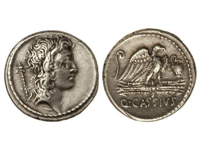 Denario. - 55 a.C. - CASSIA-7. - Q. Cassius Longinus. - Rev.: Águila a derecha sobre haz de rayos entre lítuo y praeferículo, debajo Q. CASSIVS. 4,20 grs. (Golpe en anverso). Cal-411; FFC-557. MBC+. - -