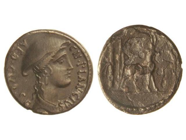 Denario. 55 a.c. PLANCIA-1. Cn. Plancius. Anv.: C. N. PLANCIVS. AED. CVR. S. C. Cabeza de Diana Planciana a derecha. 3,70 grs. AR. Pátina negra. (Oxidaciones en reverso). Cal-1122; FFC-991. MBC+/(MBC).