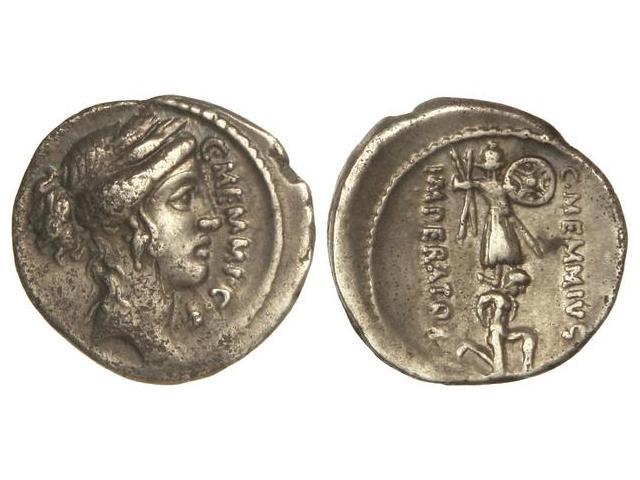 Denario. - 56 a.C. - MEMMIA-10. - C. Memmius C. f. - Rev.: Cautivo de rodillas a derecha, detrás trofeo, a izquierda IMPERATOR, a derecha C. MEMMIVS. 3,70 grs. Pátina. (Oxidaciones en anverso). Cal-987; FFC-915. MBC+. - -