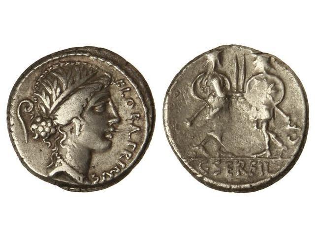 Denario. - 57 a.C. - SERVILIA. - C. Serveilius C. f. - Rev.: Dos guerreros de pie, uno frente a otro con espadas y escudo con estrella en el centro. En exergo: C. SERVEIL. En campo a derecha C.F. 4 grs. (Pequeñas rayitas. Acuñación algo floja en reverso). FFC-1123. MBC+. - -