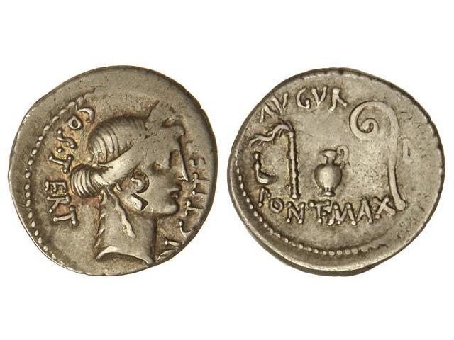 Denario. 59-44 a.C. JULIO CÉSAR. Anv.: COS. TERT. DICT. ITER. Cabeza de Ceres a derecha. Rev.: AVGVR. PONT. MAX. D. Símpulo, aspersorio y bastón de Augur. (Marca o resello en anverso). C-4. MBC/(MBC+).