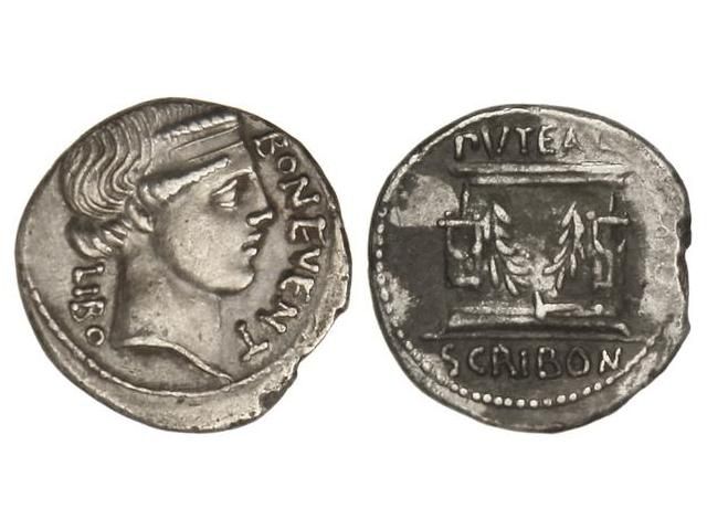 Denario. 62 a.C. SCRIBONIA-8a. L. Scribonius Libo. Rev.: El pozo scriboniano adornado con guirnaldas, debajo martillo. En exergo: SCRIBON. Encima PVTEAL. 3,69 grs. (Oxidaciones limpiadas en reverso). Cal-1248; FFC-1102. MBC+/MBC.