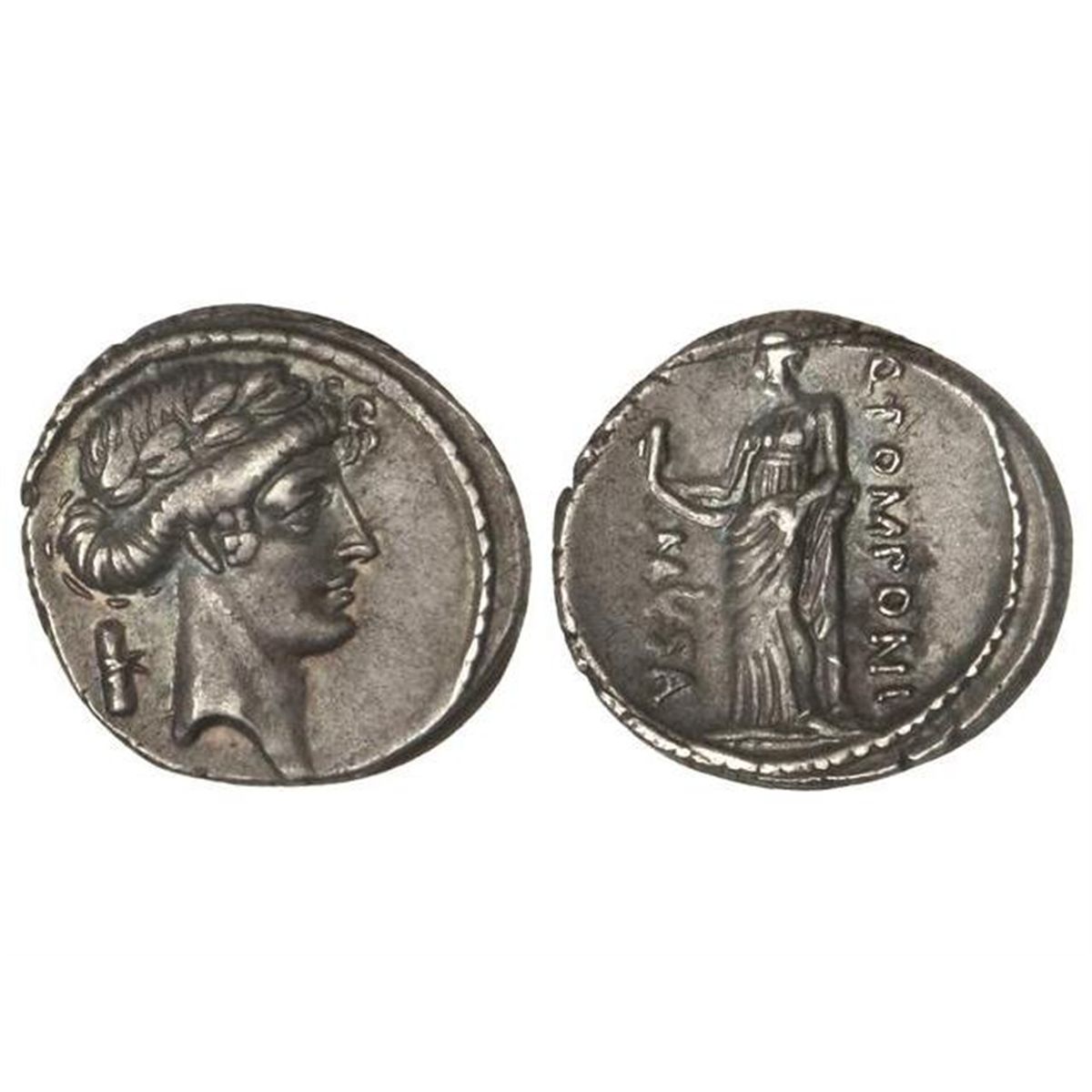 Denario. 66 a.C. POMPONIA-11. Q. Pomponius Musa. Anv.: Cabeza laureada de Apolo a derecha, detrás volumen. Rev.: La musa Clio en pie a izquierda con un libro en la mano apoyandose en una columna; a izquierda MVSA, a derecha Q. POMPONI. 4 grs. Pátina. Cal-1182; FFC-1035. MBC+.