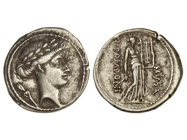 Denario. 66 a.C. POMPONIA-17a. Q. Pomponius Musa. Rev.: La musa Terpsicore en pie a derecha, a izquierda Q. POMPONI, a derecha MVSA. 4,10 grs. (Grafitis en anverso). RARA. Cal-1188; FFC-1042. E