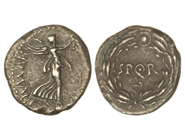 Denario. 68-69 d.C. GUERRAS CIVILES. Anv.: (SALVS GENERIS) HVMANI. Victoria en pie a derecha. Rev.: S. P. Q. R. dentro de corona de roble. RARA. C-421. (MBC+).