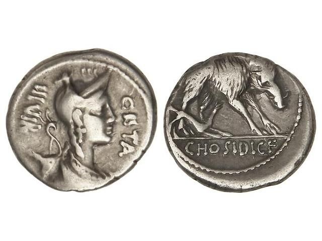 Denario. 68 a.C. HOSIDIA-1. C. Hosidius C.f. Geta. Anv.: Busto diademado de Diana a derecha, con arco y carcaj, alrededor GETA III. VIR. 3,78 grs. (Algo descentrado en reverso). Cal-618; FFC-748. MBC-.