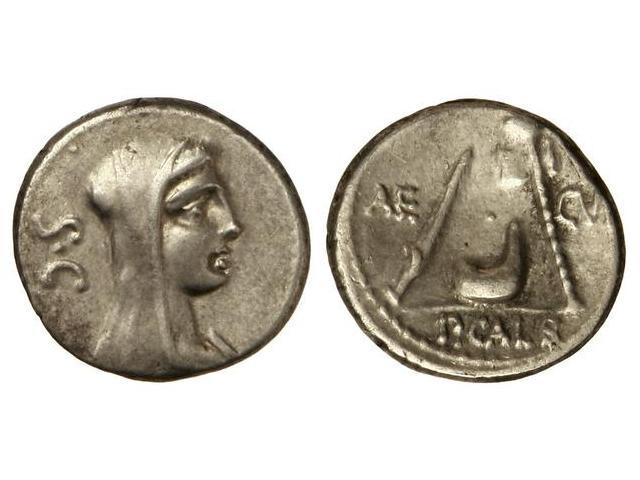 Denario. - 69 a.C. - SULPICIA-7. - P. Sulpicius Galba. - Rev.: Cuchillo de sacrificio, símpulo y hacha. En campo AE-CVR. En exergo: P. GALB. 4 grs. Cal-1290; FFC-1135. MBC+. - -