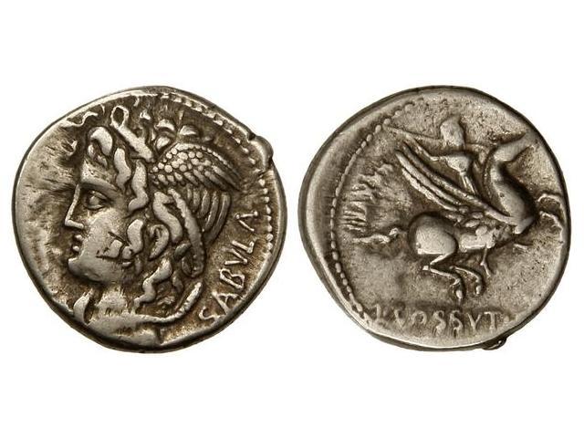 Denario. 74 a.C. COSSUTIA-1. L. Cossutius C. f. Sabula. Anv.: Cabeza alada de Medusa a izquierda, detrás SABVLA. (Marca de cambista en anverso). Cal-515; FFC-655. MBC/MBC-.