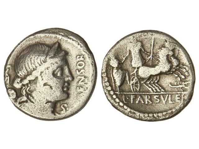 Denario. 75 a.C. FARSULEIA-1. L. Farsuleius Mensor. Rev.: Guerrero con lanza en biga a derecha, a su lado otro personaje, debajo de los caballos escorpión. En exergo: FARSVLEI. 3,60 grs. Marca de cambista en anverso. Cal-578; FFC-707. MBC-.