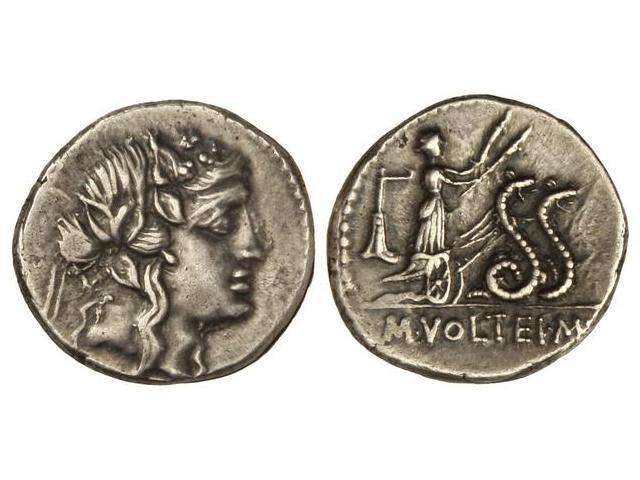 Denario. - 78 a.C. - VOLTEIA-3. - M. Volteius M.f. - Rev.: Ceres con dos antorchas en biga arrastrada por serpientes a derecha, detrás símbolo. En exergo: M. VOLTEI. M. F. 3,90 grs. Cal-1393; FFC-1231. EBC-. - -
