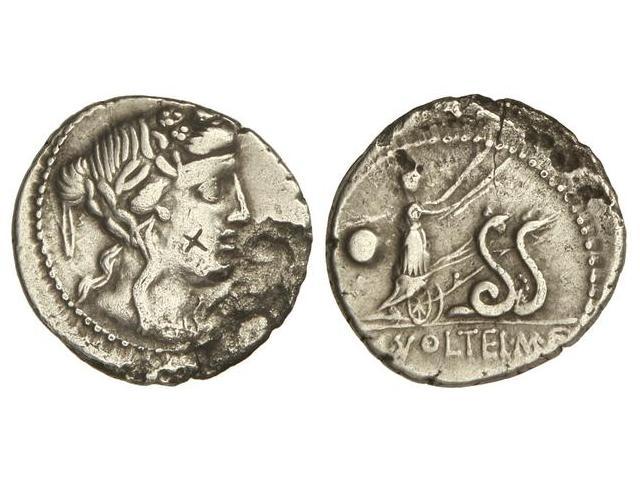 Denario. 78 a.C. VOLTEIA-3. M. Volteius M. f. Rev.: Ceres con dos antorchas en biga, arrastrada por serpientes de derecha, detrás símbolo. En exergo: M. VOLTEI. M. F. 3,60 grs. Marca de cambista. (Oxidaciones limpiadas). Cal-1393; FFC-1231. MBC.
