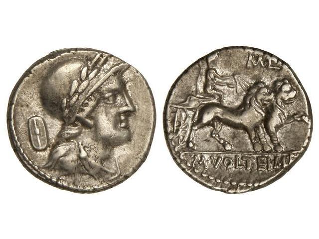 Denario. 78 a.C. VOLTEIA-4. M. Volteius M. f. Rev.: Cibeles en biga arrastrada por leones, encima letras. En exergo: M. VOLTEI. M. F. Cal-1394; FFC-1232. MBC+.