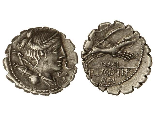 Denario. - 79 a.C. - CLAUDIA-5. - Ti. Claudius Nero. - Rev.: Victoria con corona y palma en biga a derecha, debajo número. En exergo: TI. CLAVD. TI. F. AP. M. 3,70 grs. AR. (Dos rayitas en anverso). Cal-426; FFC-567. MBC+. - -