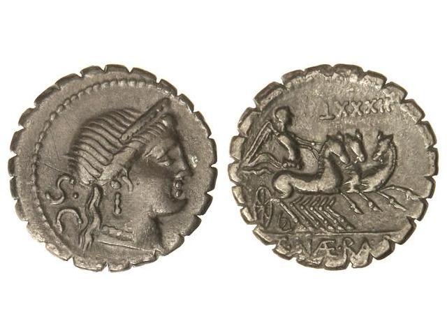 Denario. 79 a.C. NAEVIA-6. C. Naevius Balbus. Rev.: Victoria en triga a derecha, encima número. En exergo: C. NAE. BALB. 3,90 grs. Pátina oscura. Cal-1041; FFC-937. MBC+.