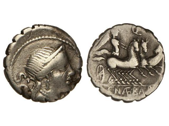Denario. 79 a.C. NAEVIA-6A. C. Naevius Balbus. Rev.: Victoria en triga a derecha, encima letra. En exergo: C. NAE. BALB. 3,70 grs. (Raya). Cal-1042; FFC-938. MBC-/BC+.