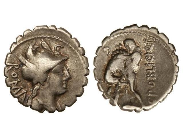 Denario. 80 a.C. POBLICIA-9. C. Poblicius Q. f. Rev.: Hércules a izquierda, estrangulando al león de Nemea, detrás C. POBLICI. Q. F. Cal-1145; FFC-1017. MBC-.