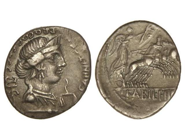 Denario. 82-81 a.C. ANNIA-2A. HISPANIA. C. Annius y Lucius Fabius. Anv.: Busto diademado de Anna Perenna a derecha, delante balanzas, detrás caduceo, debajo símbolo, alrededor C. ANNI. T. F. T. N. PRO. COS. EX S. C. Leye