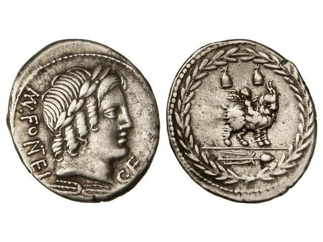 Denario. 85 a.C. FONTEIA-10. Mn. Fonteius C. F. Anv.: Cabeza laureada de Apolo Vejovis a derecha, debajo haz de rayos. Leyenda, delante C.F., detrás M. N. FONTEI. Cal-590; FFC-719. MBC+.