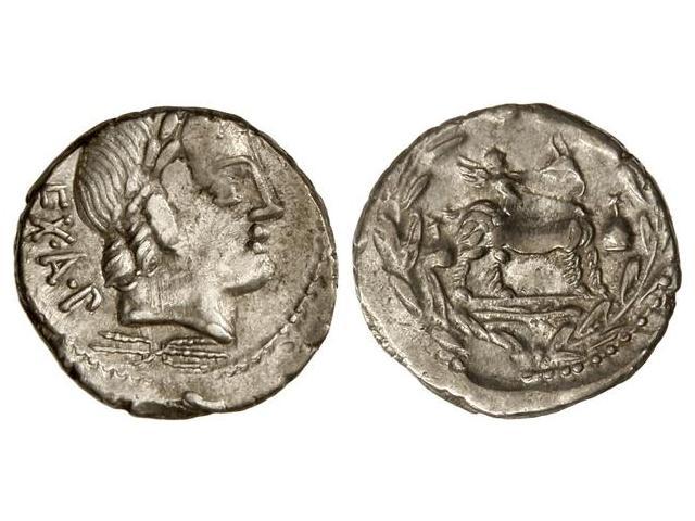 Denario. 85 a.C. FONTEIA-12. Mn. Fonteius C. f. Anv.: Cabeza laureada de Apolo a derecha, debajo haz de rayos. EX A. P. Rev.: A los lados los gorros de los Dióscuros. (Golpes en el campo del reverso). RARA. Cal-593; FFC-722. MBC+.
