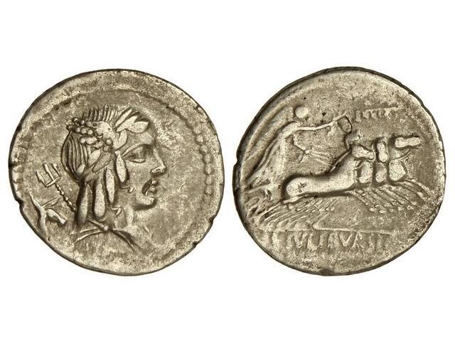 Denario. 85 a.C. JULIA-5a. L. Julius Bursio. Rev.: Victoria con corona en cuadriga a derecha, encima ¿número?. En exergo: IVLI. BVRSIO. 3,60 grs. Pequeña marca de cambista en reverso. Cal-635; FFC-768. MBC.