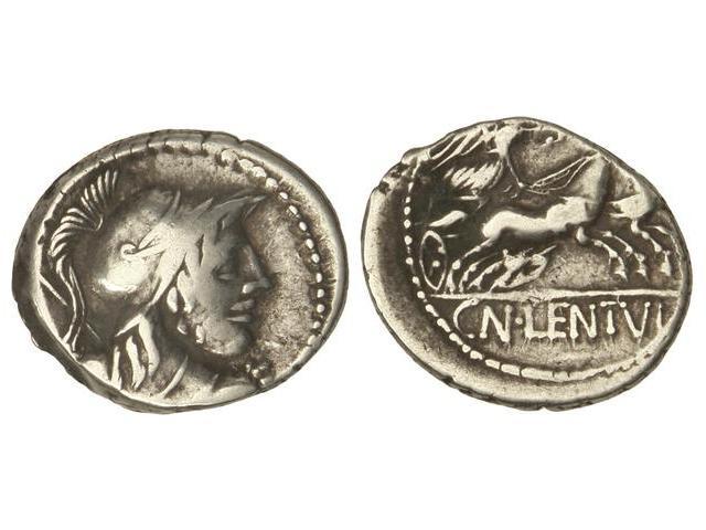 Denario. 88 a.C. CORNELIA-50. Cn. Cornelius Lentulus Marcellinus. Rev.: Victoria con corona en biga a derecha. En exergo: CN. LENTVL. 3,90 grs. (Pequeñas rayitas). Cal-484; FFC-624. MBC.