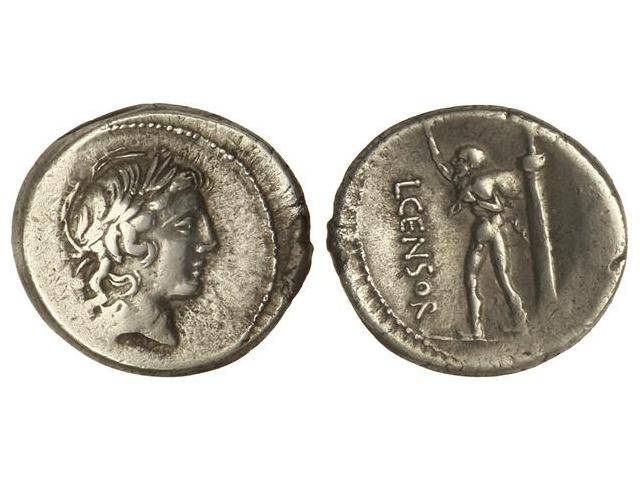 Denario. 88 a.C. MARCIA-24. L. Marcius Censorinus. Rev.: Sátiro Marsyas, de pie a izquierda, en el campo a derecha columna surmontada por estatua, a izquierda en vertical L. CENSOR. 3,80 grs. (Oxidación en canto). Cal-957; FFC-888. (MBC+).