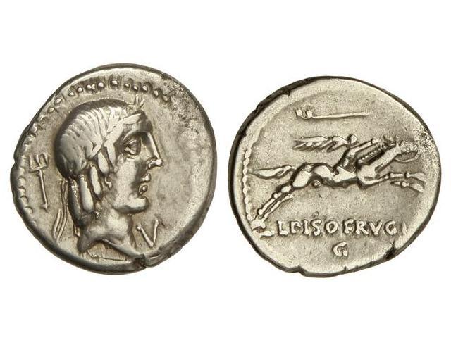 Denario. 90-89 a.C. CALPURNIA. L. Calpurnius Piso Frugi. Anv.: Cabeza laureada de Apolo a derecha, detrás símbolo, delante número. 3,90 grs. Cal-380u; FFC-280. MBC+/MBC.