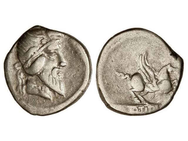 Denario. 90 a.C. TITIA-1. Q. Titius. Anv.: Cabeza del dios Mutinus Titinus a derecha. (Ligeramente descentrada en reverso). Cal-1301; FFC-1142. MBC/MBC-.