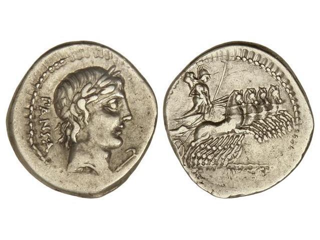 Denario. 90 a.C. VIBIA-1. C. Vibius C. f. Pansa. Anv.: Cabeza de Apolo a derecha, delante símbolo, detrás PANSA. 4,01 grs. Cal-1345; FFC-1187. MBC+.